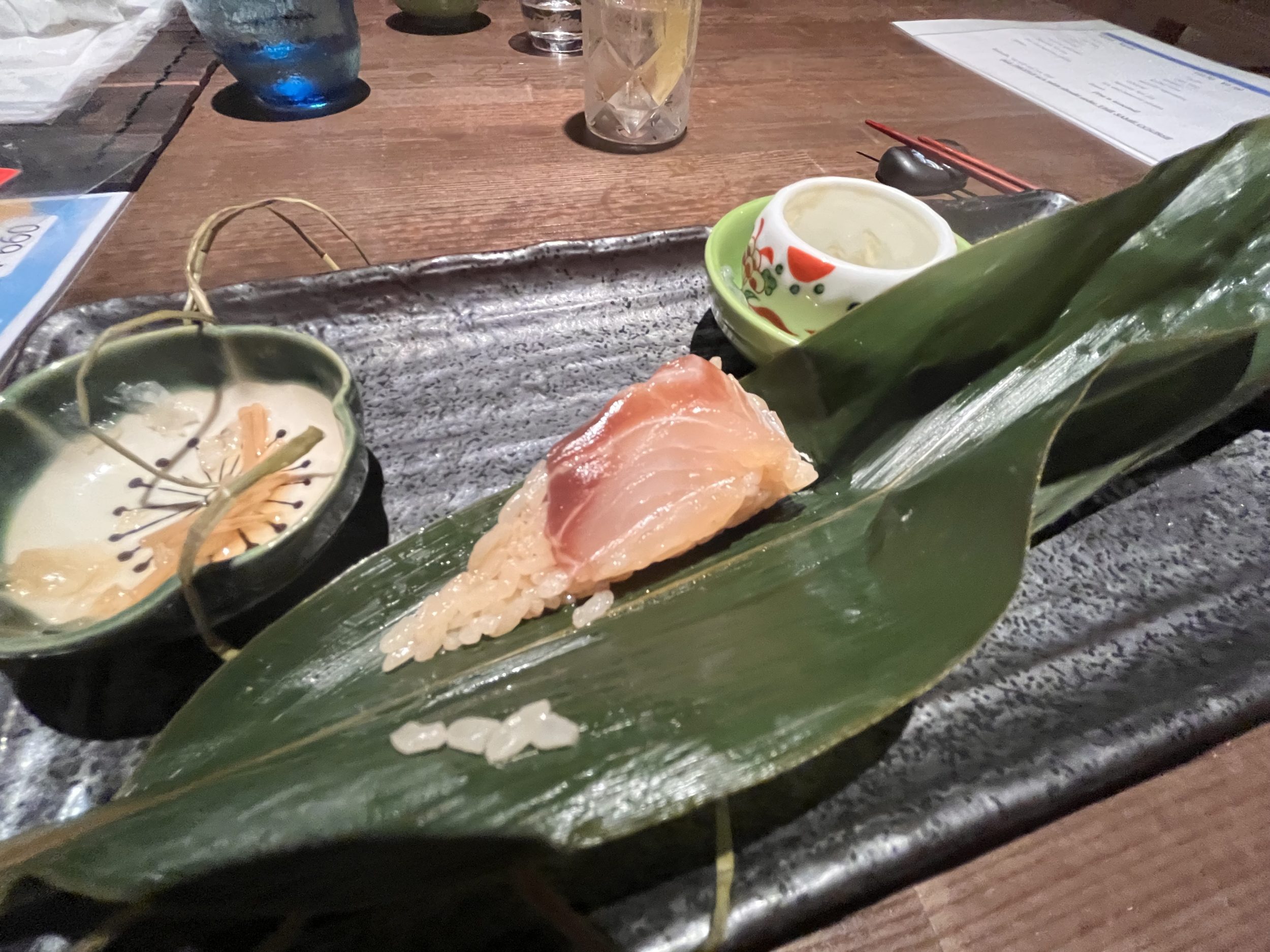 Nous avons pris le menu Tsuki (45 €), malgré le menu, il y a toujours un peu, beaucoup de surprise, au niveau des proportions mais surtout des goûts, avec beaucoup de goûts vinaigrés d’une manière générale. Mais nous avons passé un super bon moment, sans discussion en anglais autour de nous (bon on était quasiment les derniers clients) et nous avons été servis à une vitesse incroyable. Ce qui nous a le plus surpris, c’est la présence d’un dessert (tout petit, genre clafoutis) mais qui est généralement absent dans les autres restaurants.