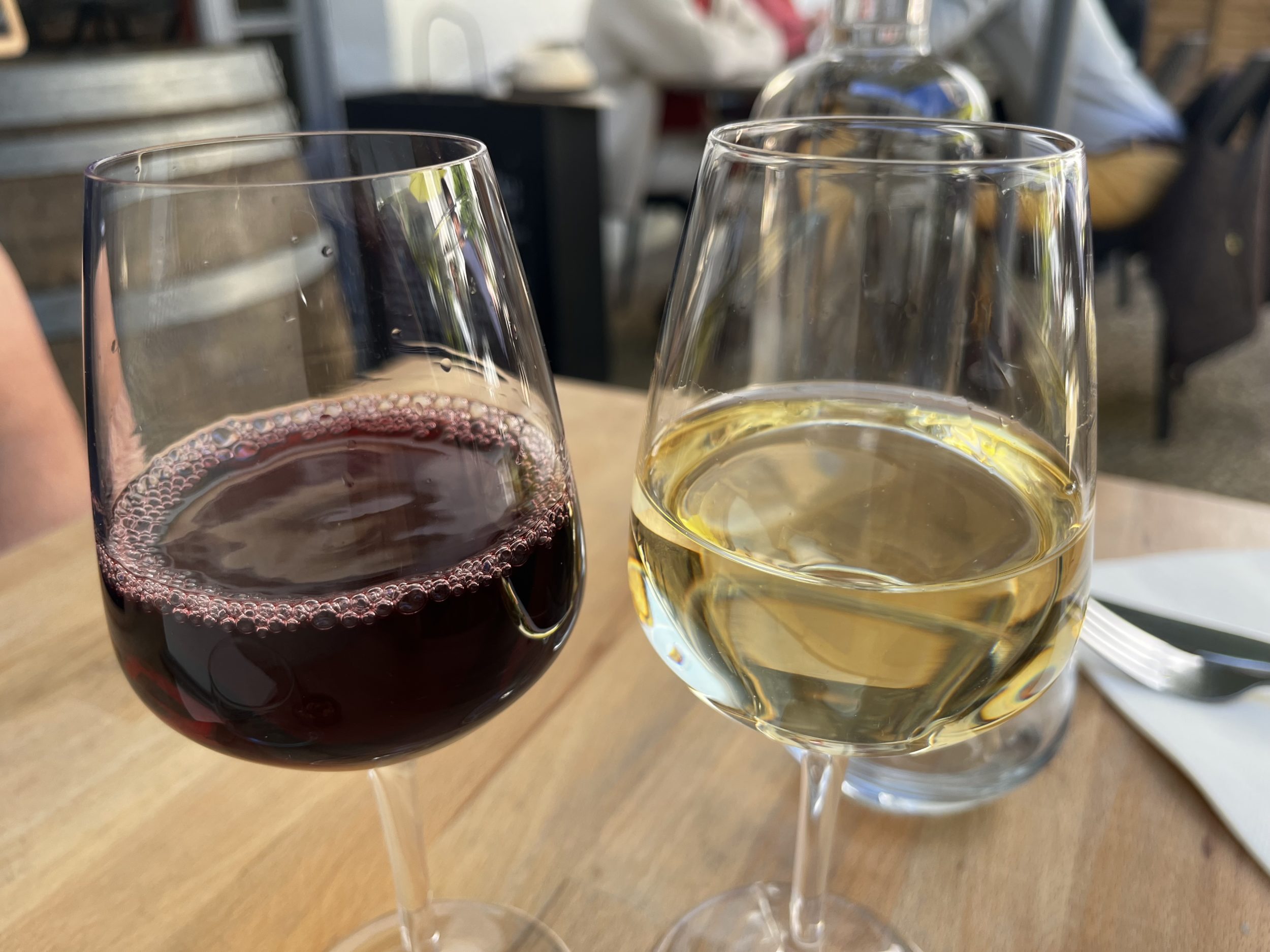 1 verre de vin blanc Côtes du Rhône et 1 verre de vin rouge Gaillac.