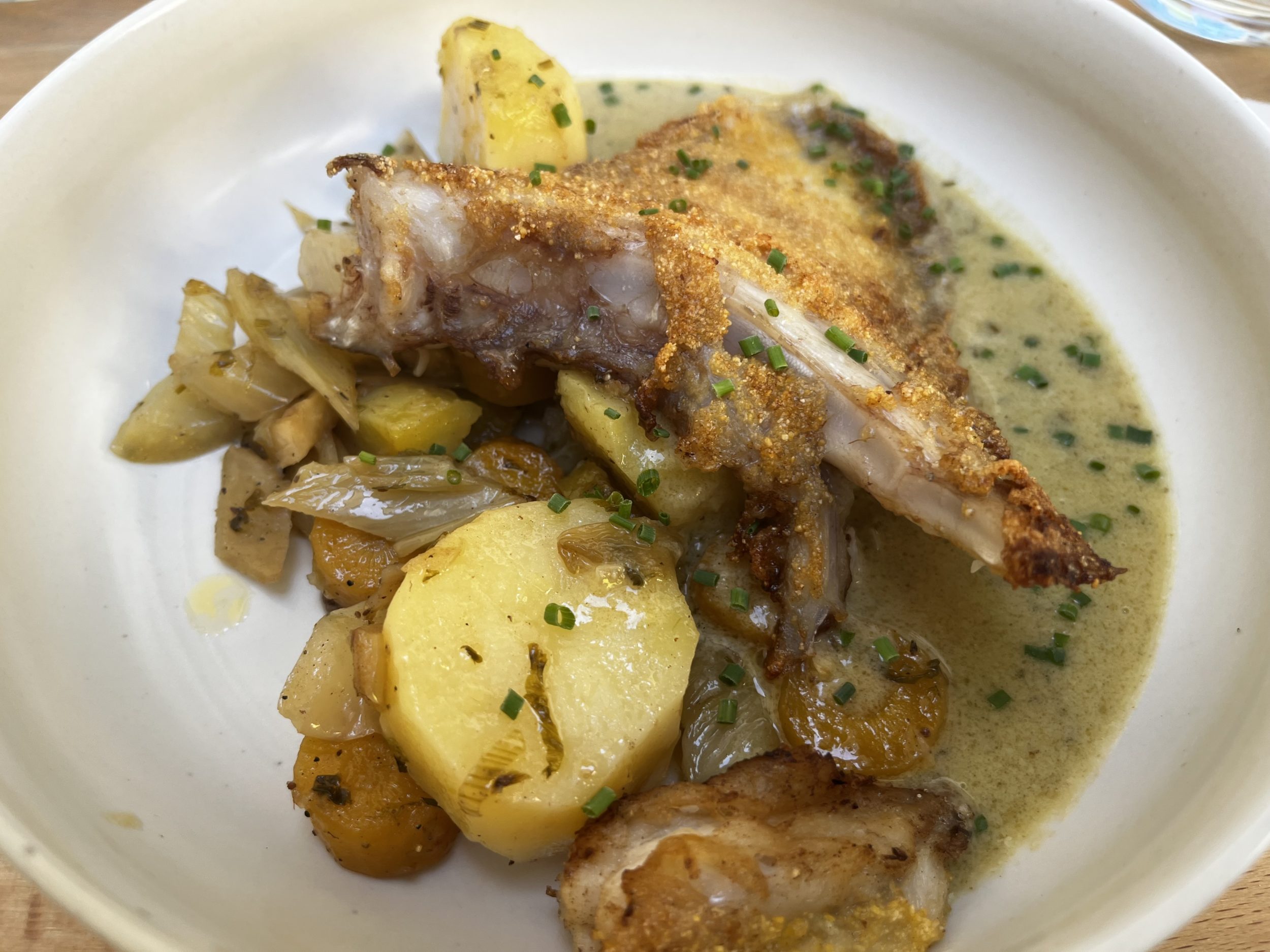 Sandrine ► Aile de raie, pommes de terre vapeur, légumes, crème fenouil, câpres.