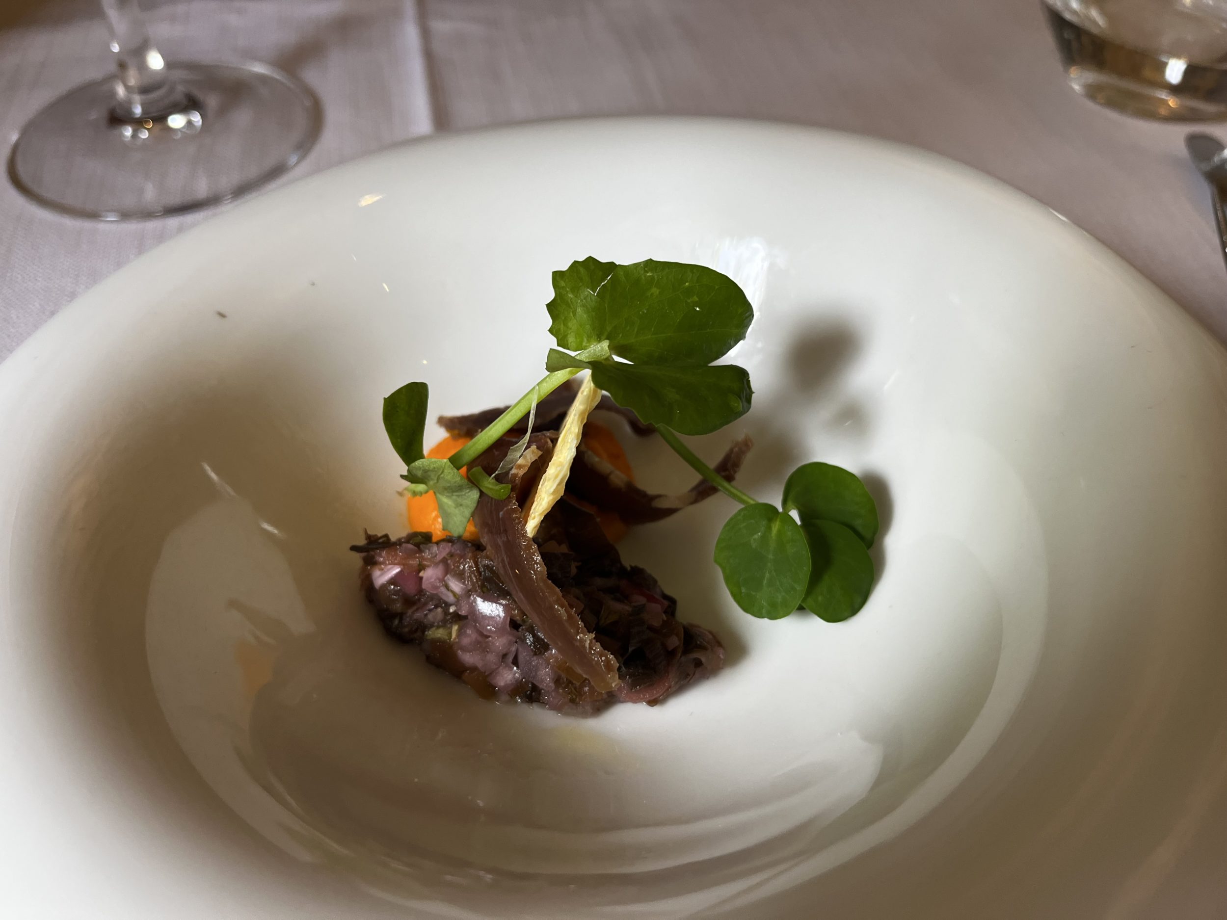 Amuse-bouche (Tartelette crème de bleu et poire confite, Crème de patate douce, oignon rouge, persil et bœuf séché).