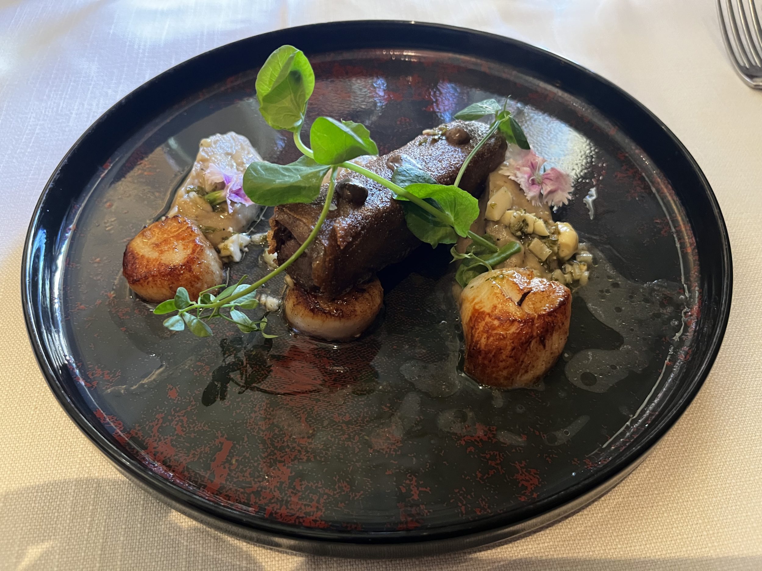 Pierre ► Les Coquilles (Saint Jacques poêlées sur crémeux de topinanbour au café, croustillant de paleron de bœuf braisé, éclats de noisette en vinaigrette).
