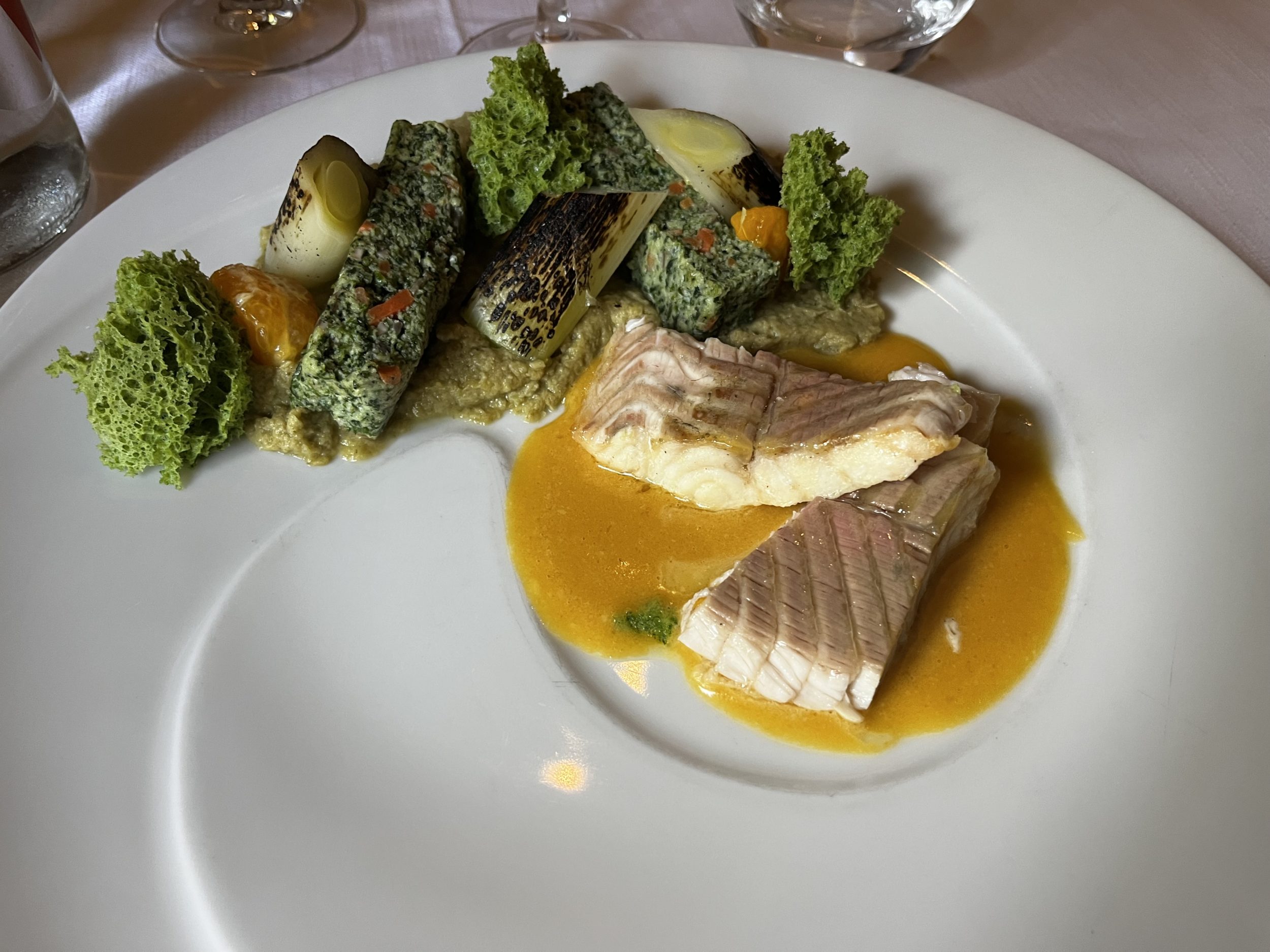 Sandrine et Pierre ► Le Retour de Pêche (Filet d’esturgeon, association d’épinards et poireaux brulés à la flamme, beurre de clémentines).