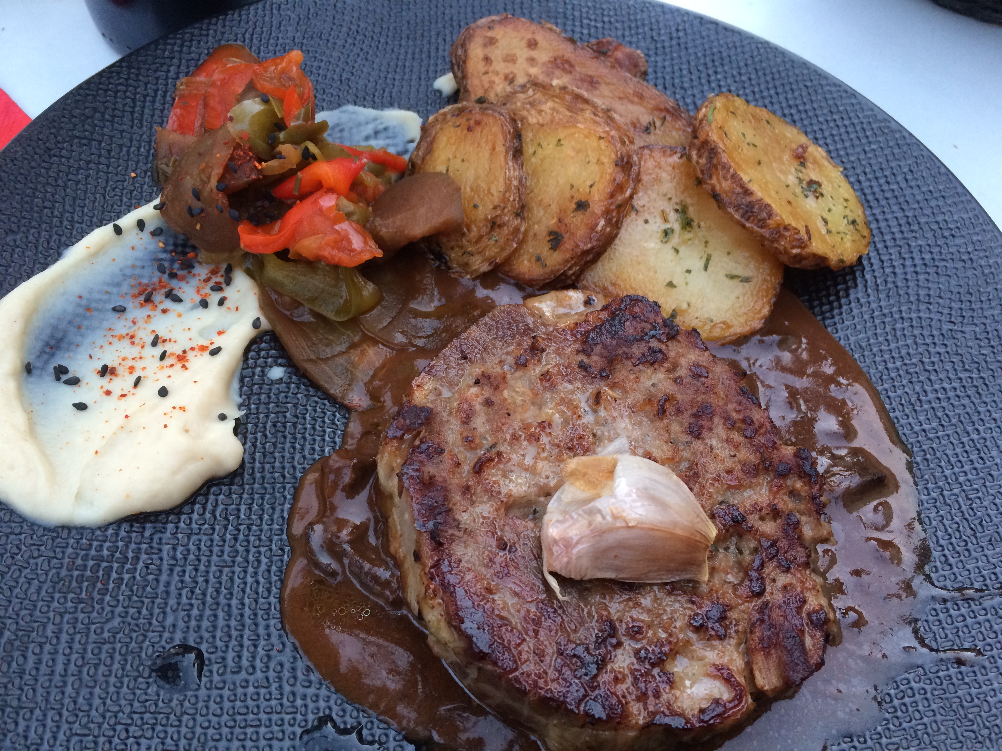 Pierre ► Burger du chef (steak haché façon boucher, pain artisanal, Coppa artisanale d’Ariège, salade, oignons confits, tomates et frites maison)