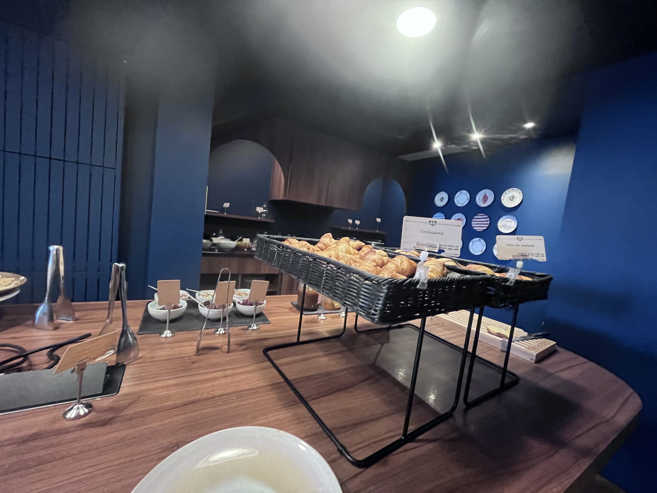 Buffet sucré (Croissants, pains au chocolat, pains, pancakes, madeleines, crêpes, confitures, pâte à tartiner, miel, fruits secs).